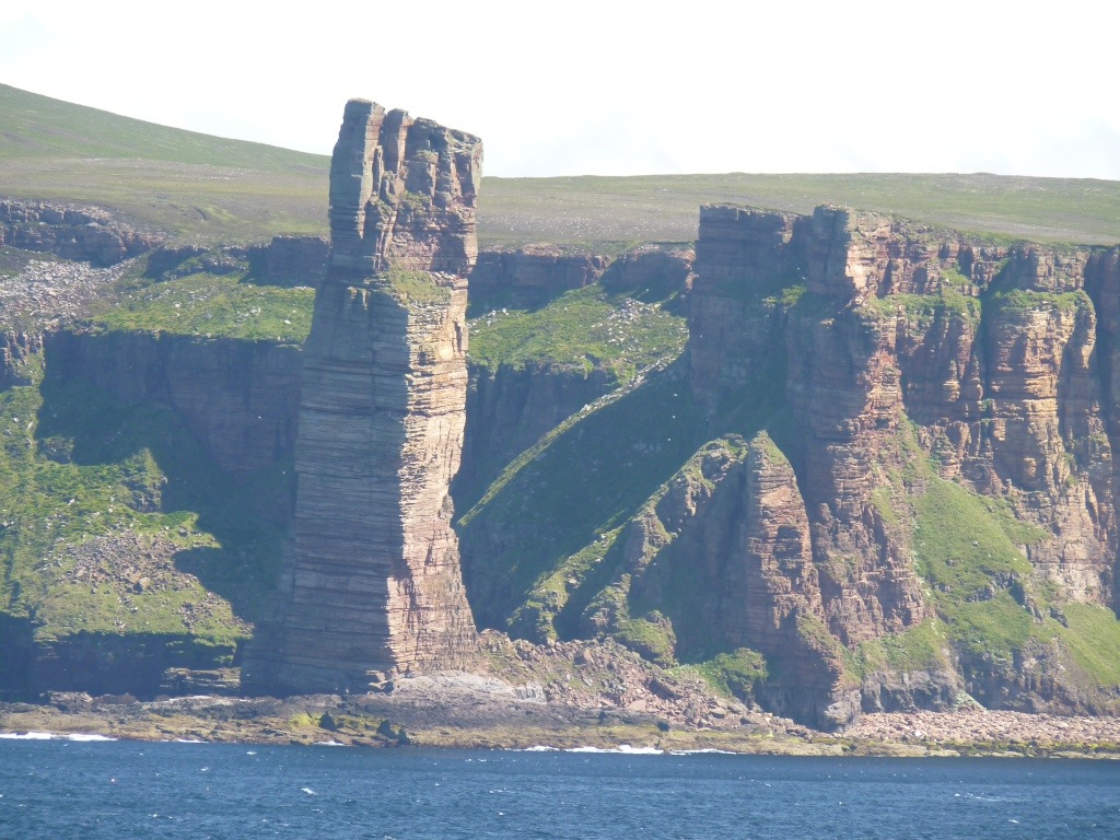 I was a little concerned about the ferry, and how they’d run things. Turns out it’s nothing. Just like our BC Ferries, roll on roll off type of thing. And to boot we left on time. The boat itself looks nothing like most of our ferries. It is a real ship with a big pointy bow. Today was clear and seas were quite smooth. Perfect sail day. So clear in fact we got a great view of Hoy and the “Old Man of Hoy” sea stack.