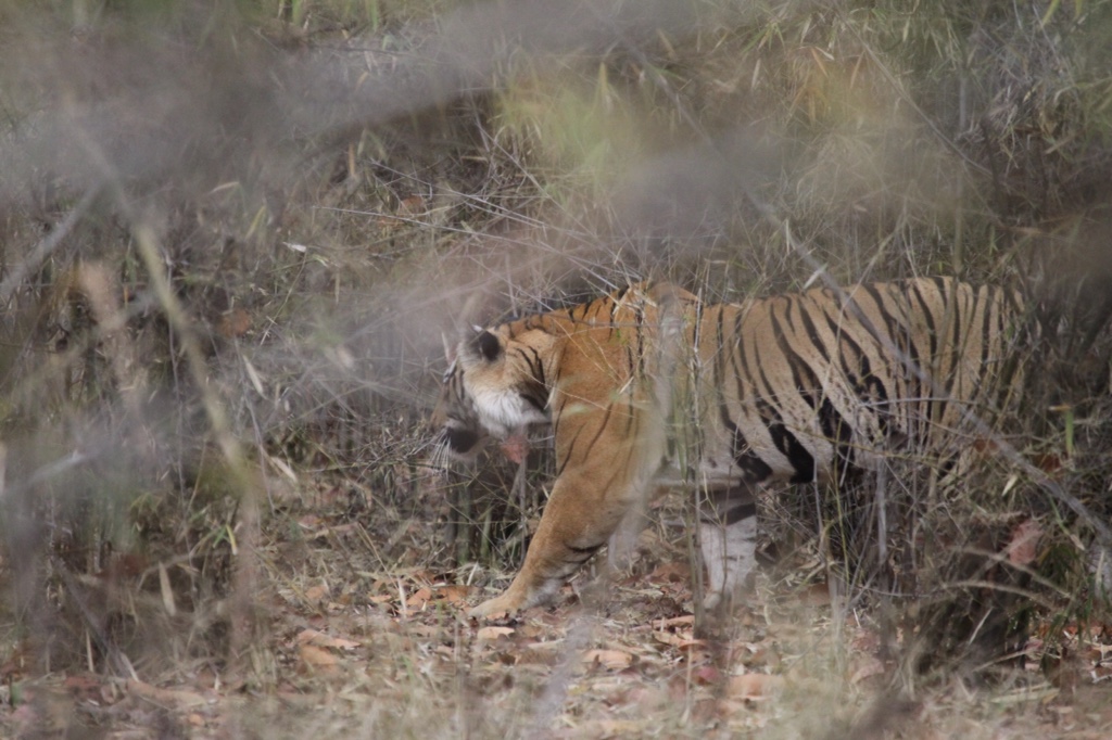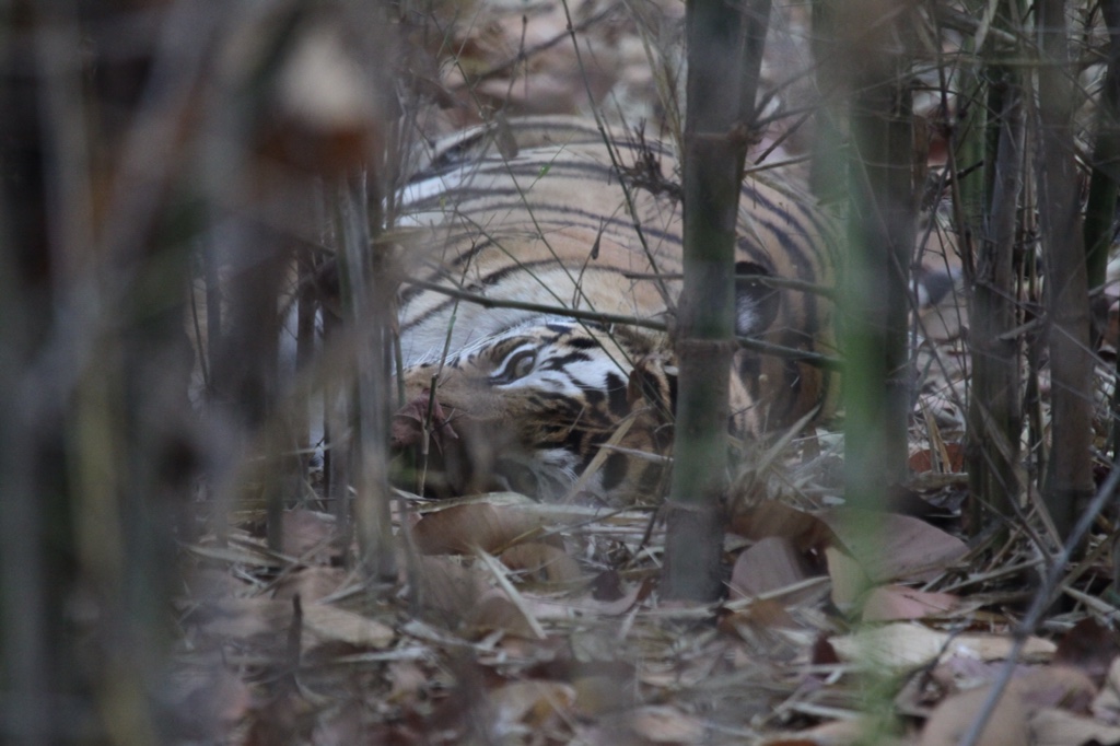Just before we got there, about 150 feet back our guide for the day (whose name we never knew) stopped us to see the her brother, a male tiger about 100′ into the bush.