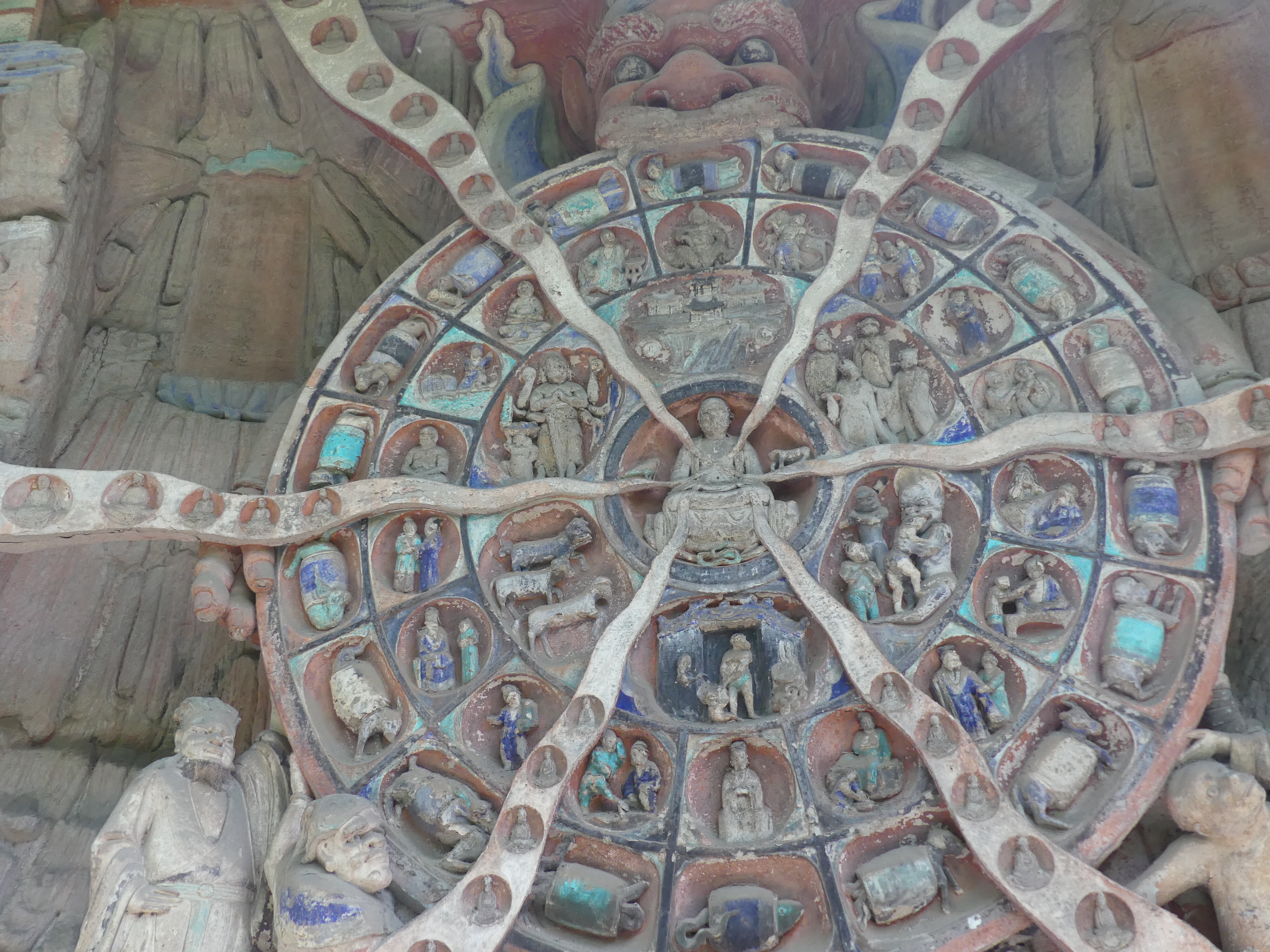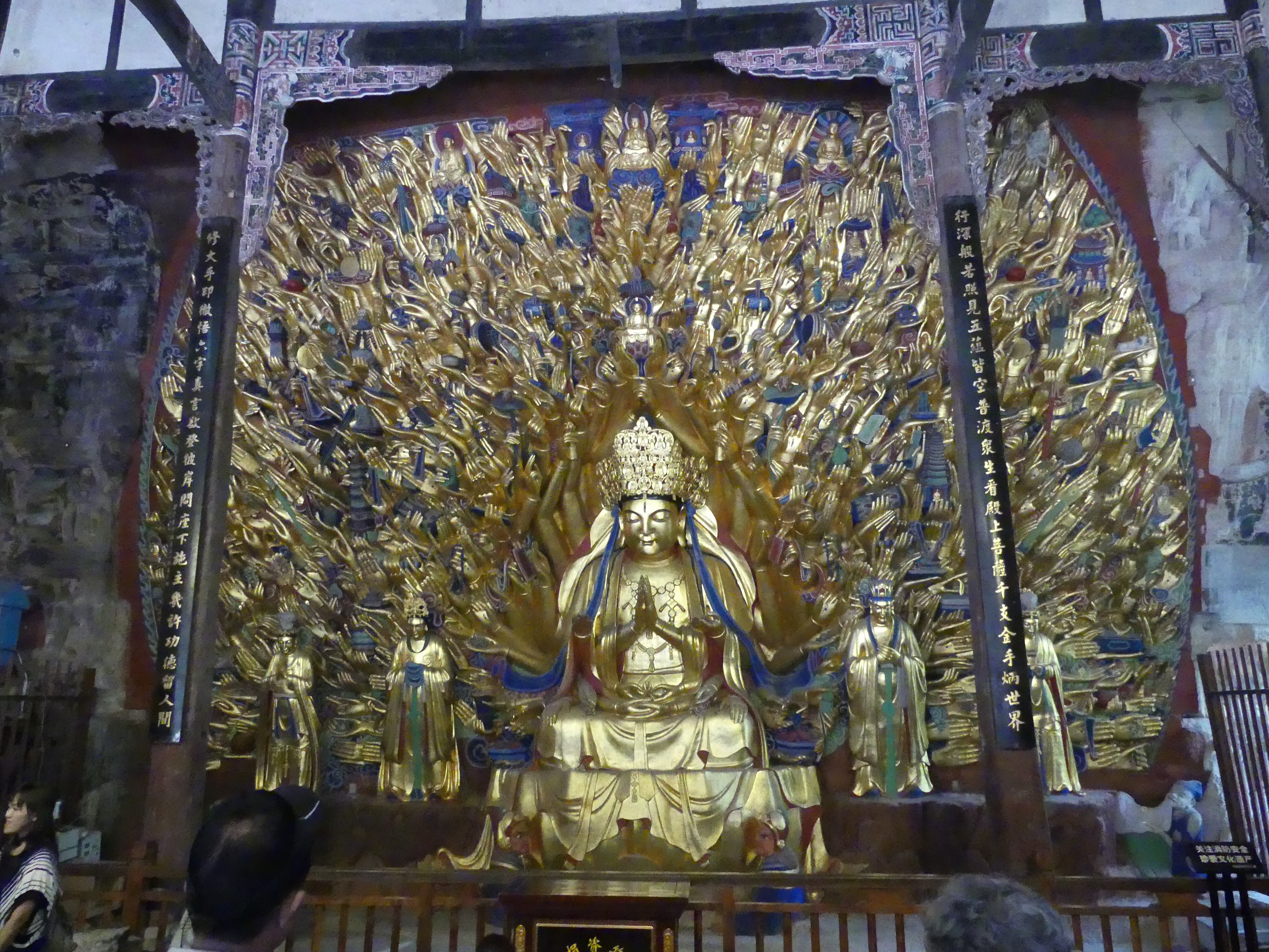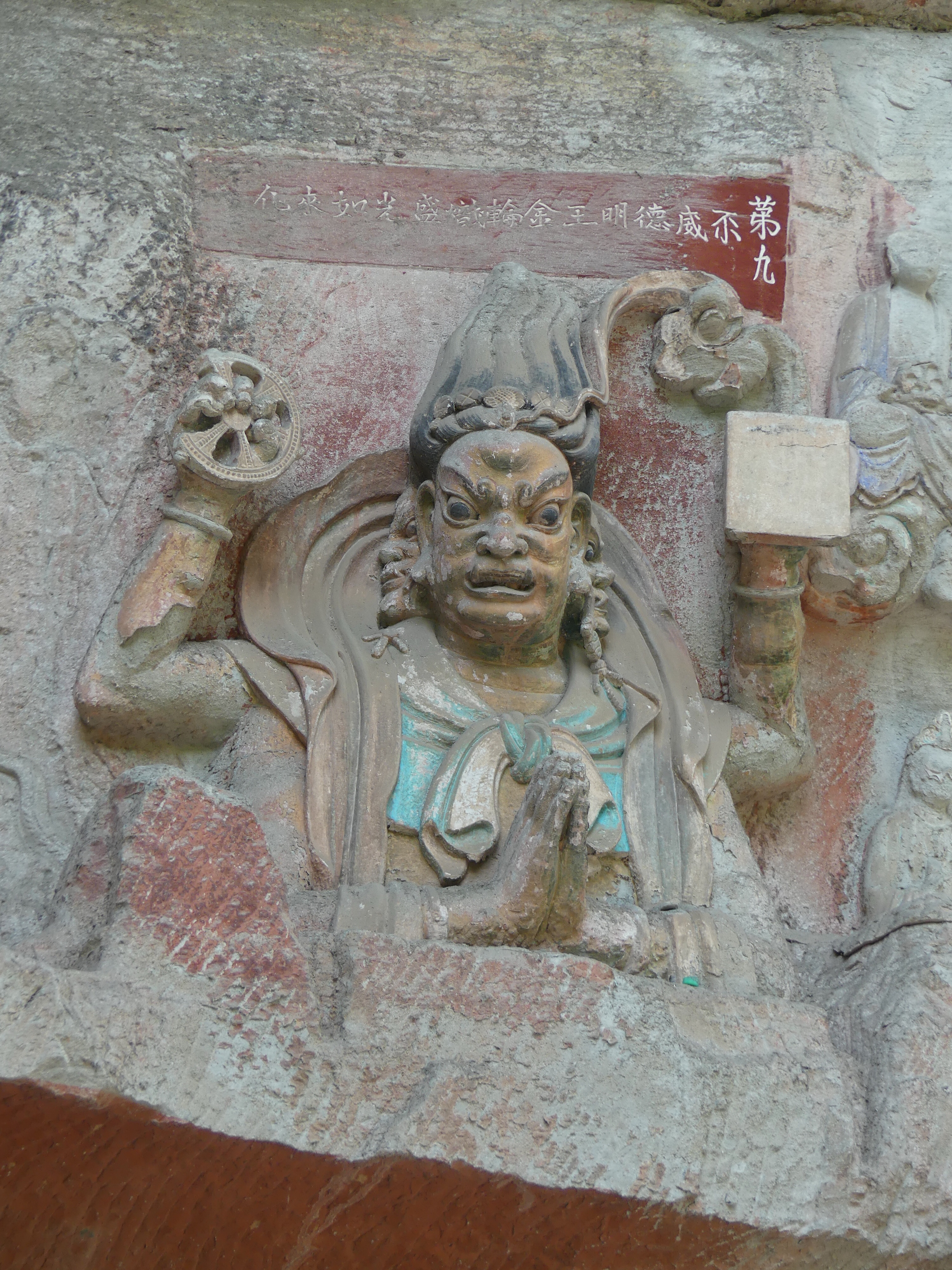 It was about a 2-hour drive to the city of Dazu. We visited two of the more popular grottos. Beishan grotto was started in 892 in the Tang Dynasty and continued over many years with many sculptors and some differing styles. The ‘cave’ depicts the Buddha as Shakyamuni with ‘generals’ guarding and defending him against Mongolian invaders (often the generals have angry faces because they are preparing for war).