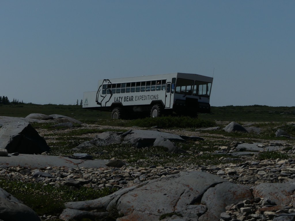 Tundra Buggies are custom built for the terrain up here. 66” tires (the same as Monster Trucks) and 2 speed low geared transmissions. Add in some semi trailer air suspension and a box for people and you’re done. Over the years they’ve been tinkered with and Wally (the owner of Lazy Bear Adventures) is definitely a tinkerer. Ours had big sliding windows and a propane stove as well as a marine toilet. Comfy school bus style seats and lots of leg room. All in all a very effective machine. They do not travel very quickly, so we drove about 20 minutes out of town in the vans to meet ‘the crawler’.