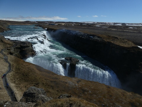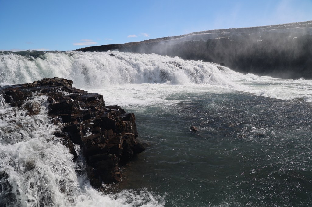 Gullfoss is a waterfall just up the road from the hot spring. We parked at the lower viewpoint and walked into the spray out to the falls.