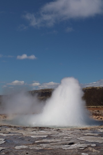 The Geysir geothermal area in Haukadalur Valley is a small but accessible hot spring on the Golden Circle in the western part of Iceland. The Strokkur geyser is the only one active right now. It erupts about every 5-10 minutes reaching 65-130 feet high. We stayed to watch a few eruptions. They were pretty cool, but hardly mind-blowing.