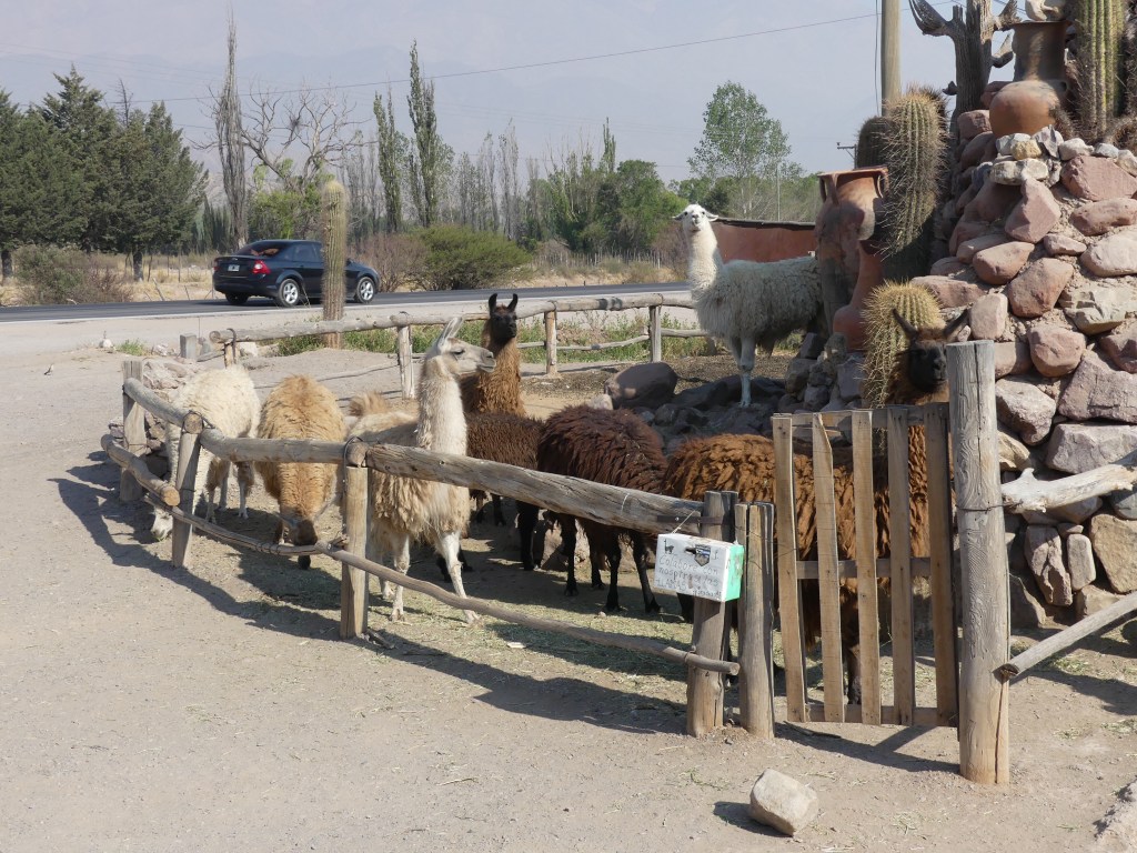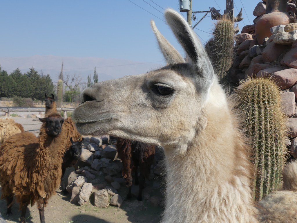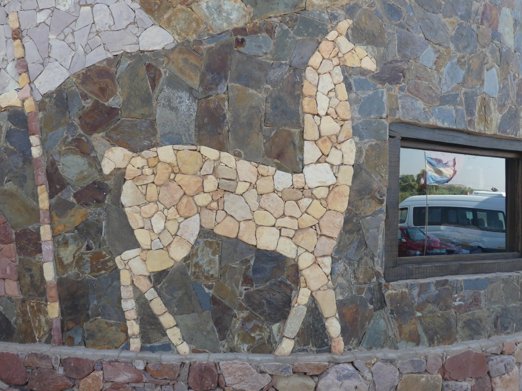 Simply put, an outcropping formed from accumulation of different sedimentary rocks from a time when the region was underwater about 600 million years ago Cactus giving the finger to the world.Vicuñas at the side of the road.Another random Independence monument – Kris thought he looks like the black knight from Monty Python’s Quest for the Holy Grail. “Tis only a scratch!”We’ve sailed over the Tropic of Cancer, slept overnight at the equator and now we’ve driven over the Tropic of Capricorn.Tropic of Capricorn monument Us on each side of the “line”.Huge stone llama as a entry point to a tourist trap ceramics storeThey had llama so of course we had to go over and say hello.