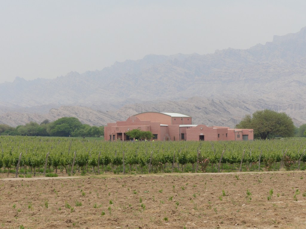 We stopped at the Bodega el Cese in Angastaco. We shared the wine tasting (degustación) with three Argentinians on their motorcycles. All rapid-fire Spanish but they offered us English tasting notes. Neither of us particularly liked their very expensive reserva wine so we ended up with a couple bottles of reasonably priced Malbec and Cab Sauv. We will likely enjoy those at our next few hotels before we have to fly again.