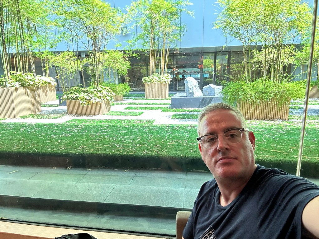Our Air Asia flight to Kota Kinabalu was supposed to leave just after noon. However as anyone who has traveled recently knows, airlines often have other ideas. We were able to rebook onto Scoot, the low cost airline of Singapore Airlines for their 630pm flight. Ironically the original flight we booked months ago with Scoot was cancelled and when they tried to rebook us on the evening flight, we decided it was too late and chose Air Asia instead. So, we had many hours to kill, but were able to access a very nice airport lounge. We had a lovely view of some bamboo and free lunch.