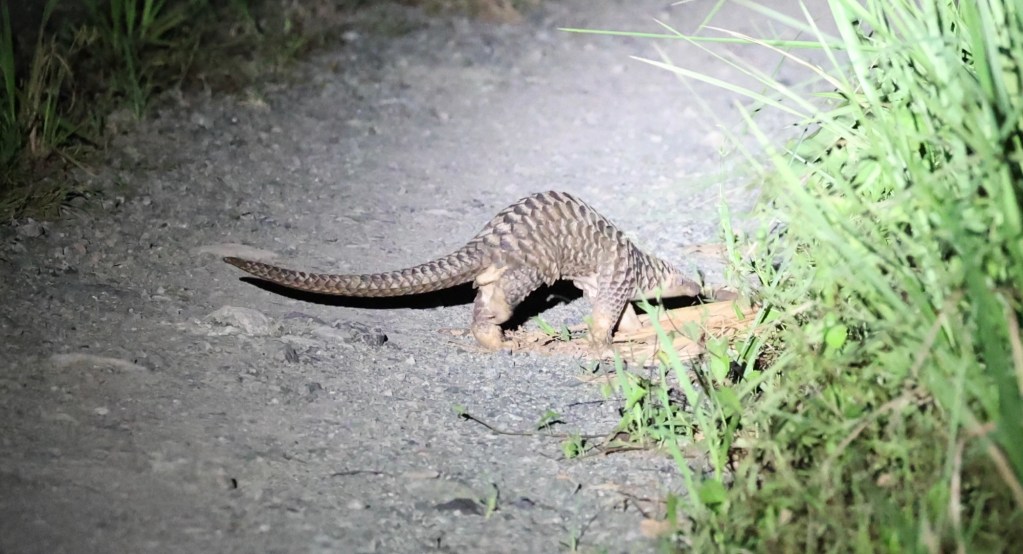 The Sunda pangolin, also known as the Malayan or Javan pangolin, get their name from the Malay word “pëngulin” which means “roller”. They can be found throughout Southeast Asia. They prefer forested habitats (primary, secondary, and scrub forest) and plantations (rubber, palm oil). A large part of their life is spent in trees. Sunda pangolin are hunted for their meat, scales and body parts used in traditional Chinese medicines; they are now critically endangered. Alfred has only seen two pangolins in 8 years!