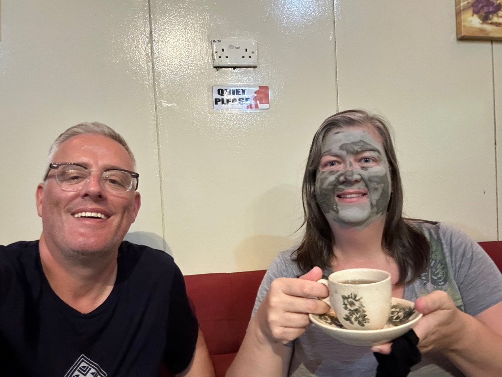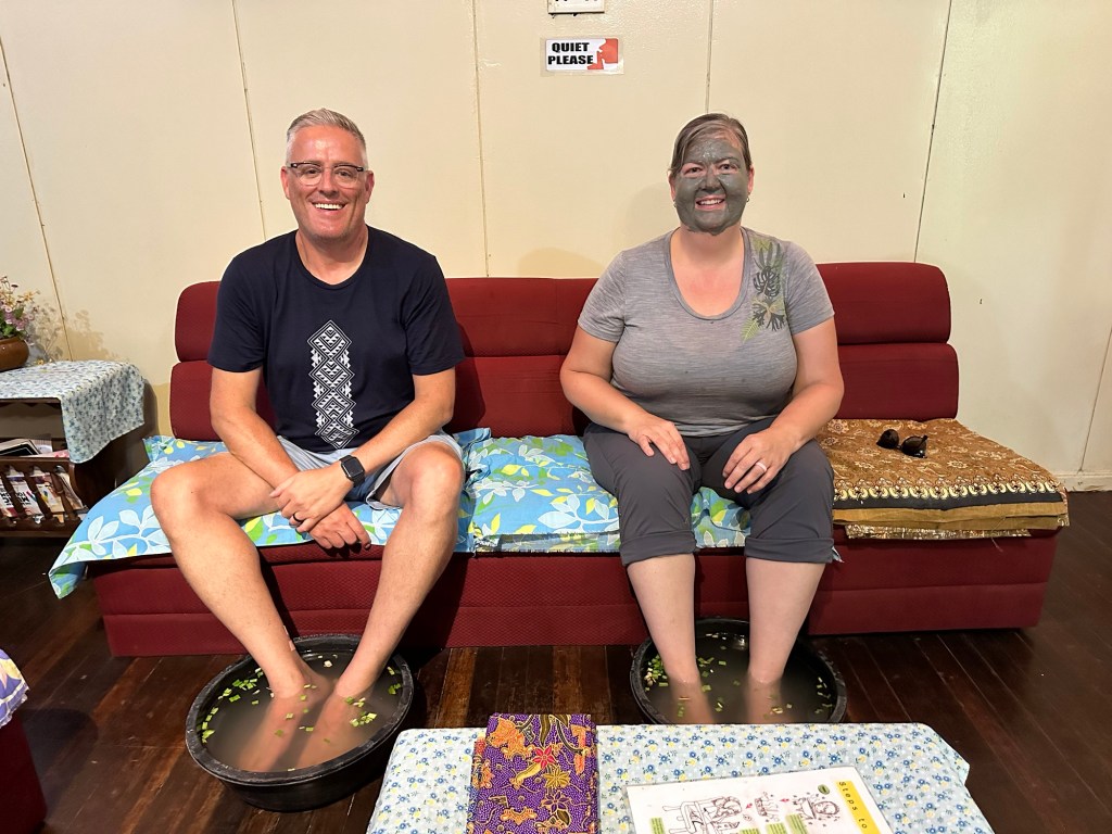 During some down time in the heat of the afternoon, we were treated to a tropical herb foot soak at the spa. Hot water and rocks from the river were added to ginger, salt, lemongrass and banana leaves. Kris also used the local volcanic mud facial.