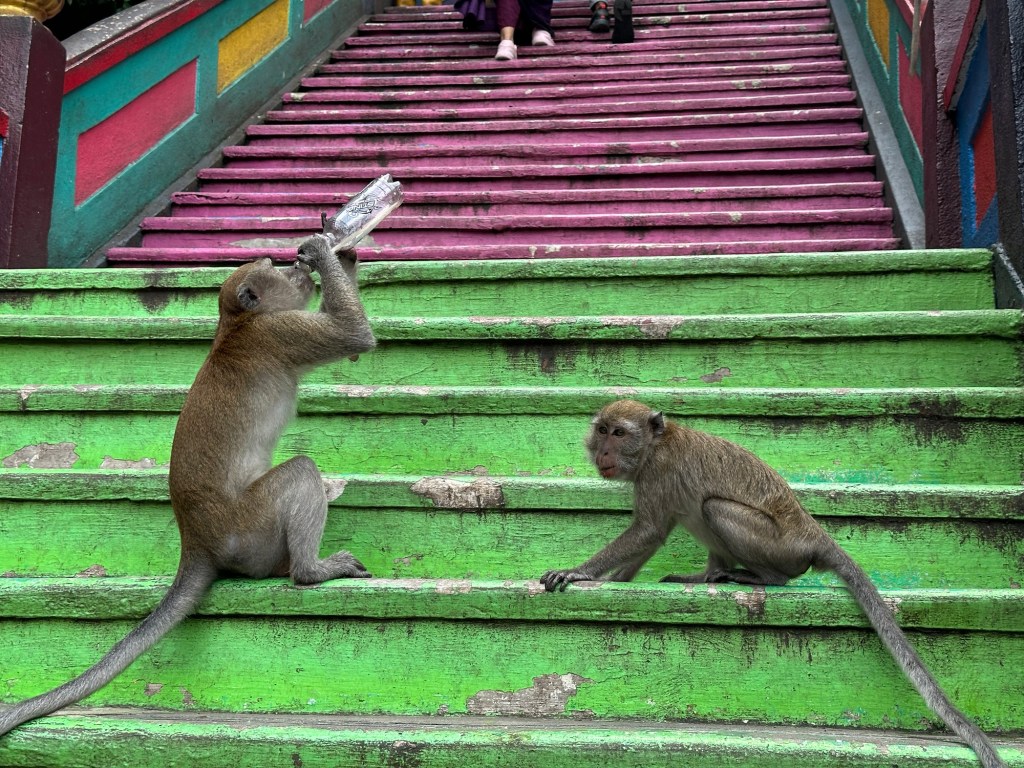 The main temple is in the cave at the top of the 272 rainbow-painted steps, where we encountered a troop of playful long-tailed macaques.