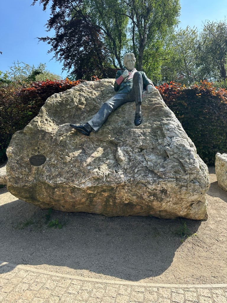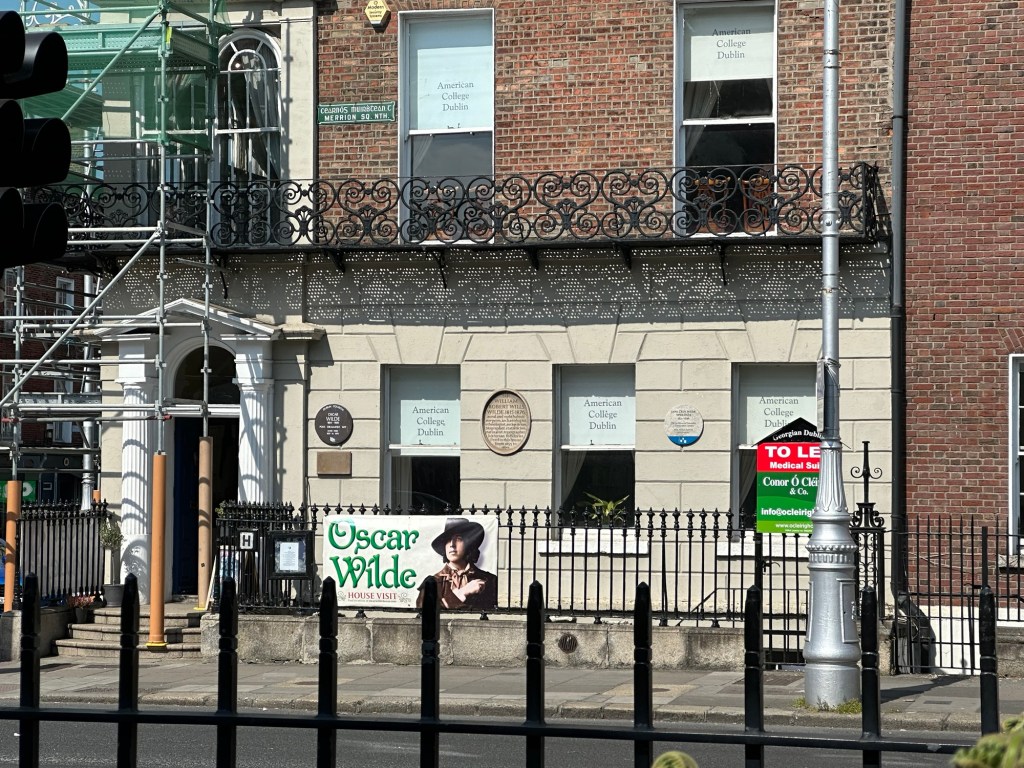 Statue of Oscar Wilde in Merrion Square and the former home of the Wilde family across the road.