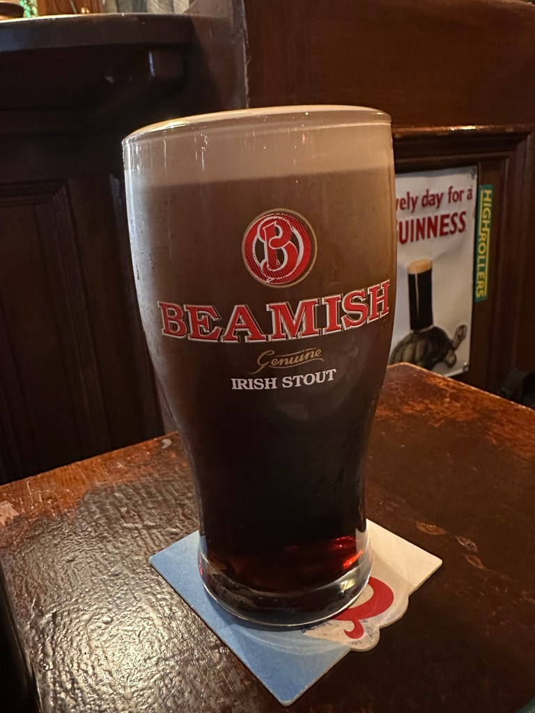 Kris plans to drink a lot of Guinness while in Ireland, but tonight had to try a Beamish stout. Dave, who hasn’t been able to drink beer in several years, found himself a Bulmers cider (known as Magners cider outside of Ireland) which is locally produced in county Tipperary.