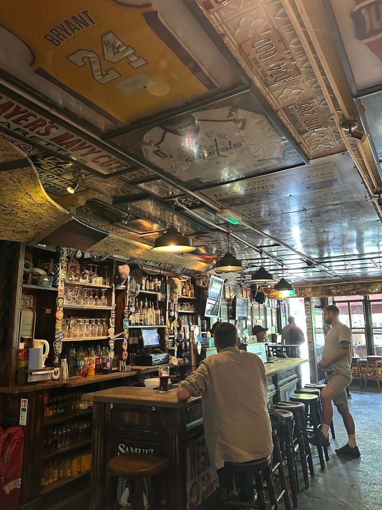 The walls and even the ceiling are decorated with Irish and American kitsch: license plates, sports jerseys, vintage signs.