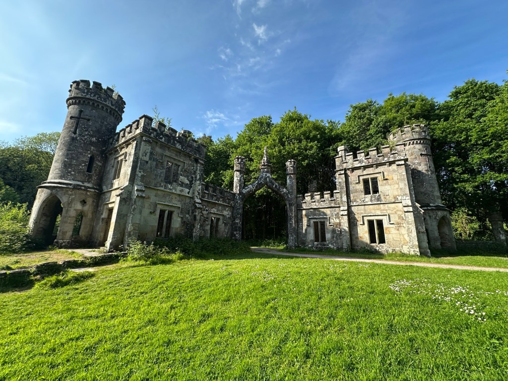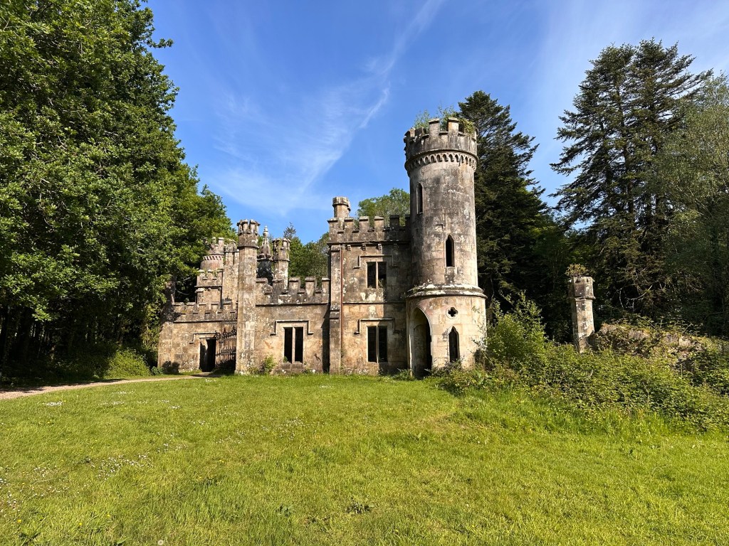 The construction of his dream castle started with these two ornate entrance lodges in 1834. But the family ran out of money during the famine and their staff quit so the mansion never got built and he and his wife had to live in the lodges.