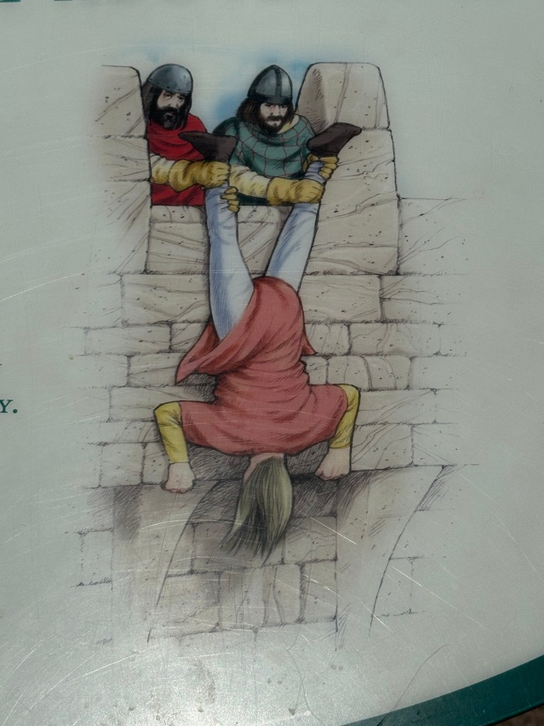We’re always so amazed at how old buildings in Europe are! The castle keep dates from 1446. The rectangular great tower was erected in two stages. In the early 15th C, it was only 4 floors, then it was added to about 40 years later to give it an odd “L” shape. The top of the “new” tower is machicolated – has square cutouts that make it look fancy!