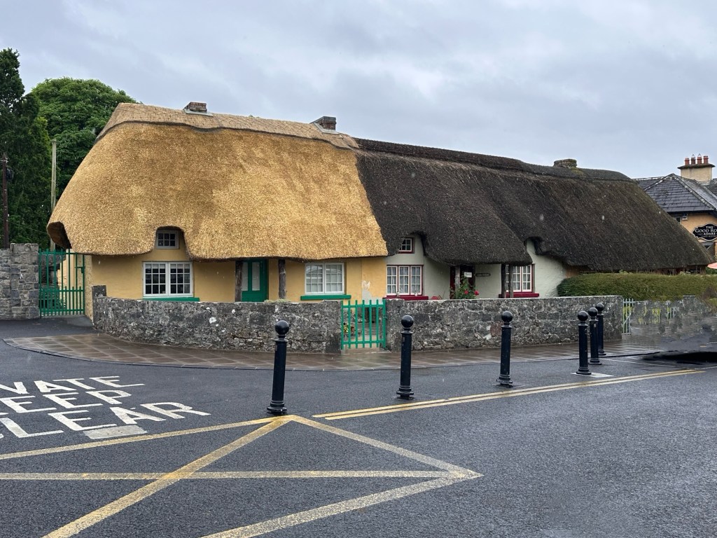 This morning we left Tralee (in the rain) and headed north into the tiny village of Adare, renowned as one of Ireland’s prettiest towns. Adare’s claim to fame is the numerous thatched roof cottages built in 1820 by Lord Dunraven. The walls were built with local stones, then covered with a mud plaster before being whitewashed.