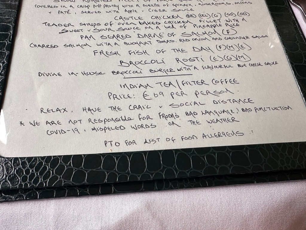 At our 5-course dinner at their wonderful restaurant, we were told they are not responsible for Froda’s bad language, bad pronunciation, misspelled words or the weather! We like the Irish sense of humour!
